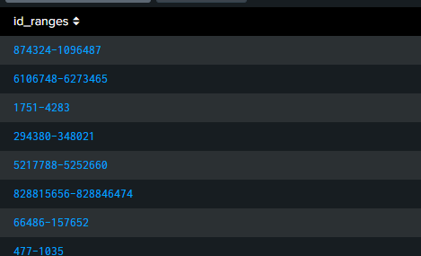 Looks like the biggest ID range is "only" 5 times bigger than the maximum... are you thinking what I'm thinking? Can we split the bigger ranges into multiple smaller ranges? Of course we can. First, find out how many sets we need per range: